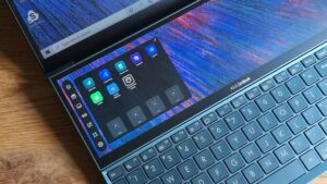 This serves the purpose of giving you a bit more room here for your folders and apps. You can have a Dropbox window open in one corner of the ScreenPad, letting you drag the files you want to upload straight from the relevant folders, all while you stream Line of Duty on iPlayer on the main screen. But there’s more to the ScreenPad than just extra pixels.