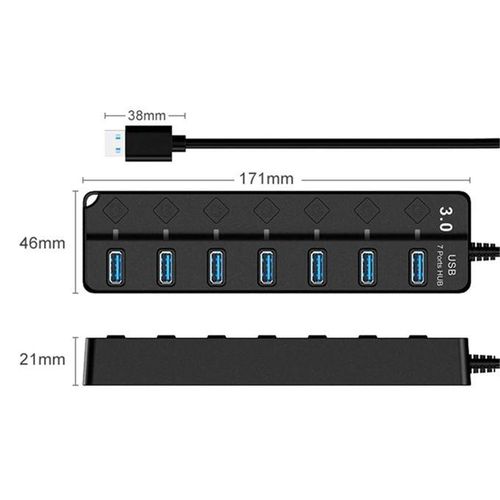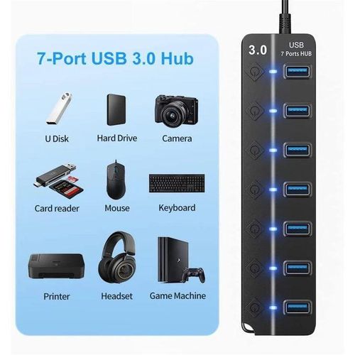 USB 3.0 Hub, 7-Port USB Data Hub Splitter With 1.2M Long Cable USB Extension With LED Individual On/Off